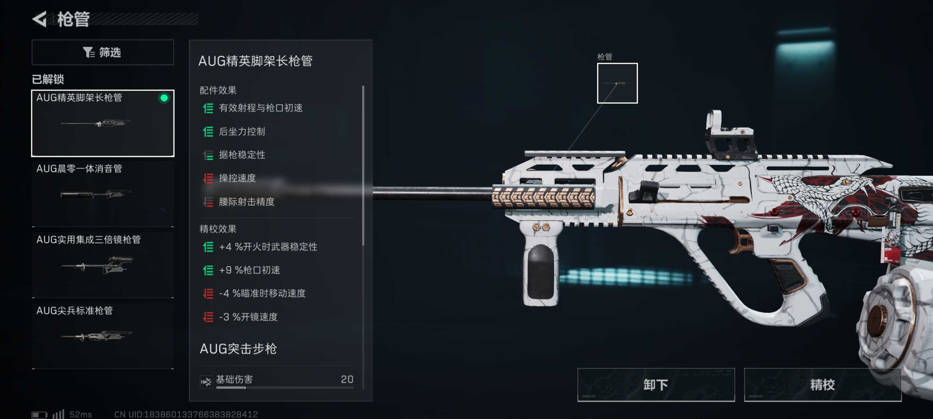 枪管选择AUG精(jing)英(ying)脚架长枪管。这个枪管对AUG来说拥(yong)有更好的稳定性,同时在AUG40米的射程上面增加了6米。