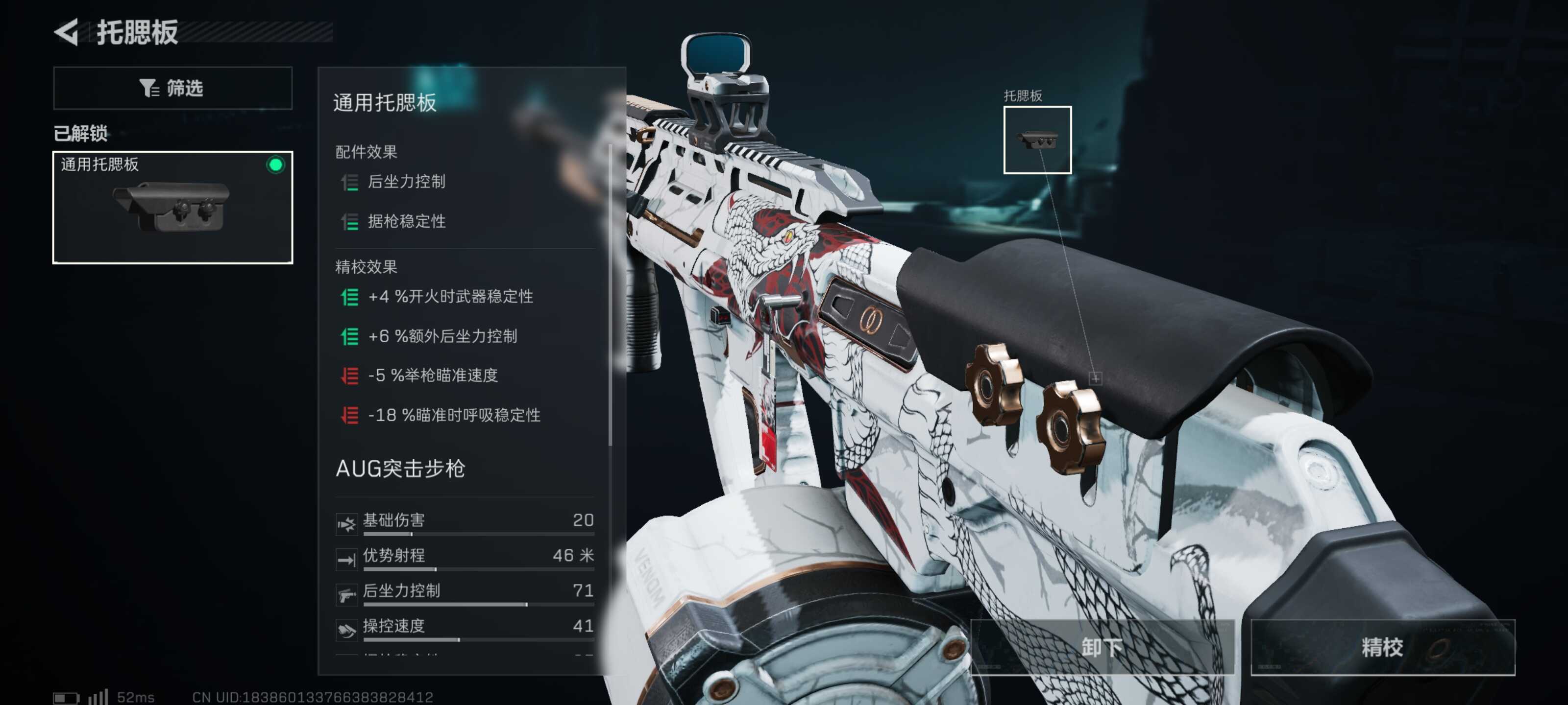 AUG专属(shu)配件——通用托腮板。在没有任何负面属性的情况下可以(yi)提(ti)升(sheng)据枪稳定性,以(yi)及(ji)小额的后坐力控制。通过以上配件,AUG这把枪50米以内可以(yi)随便压枪的了,可以(yi)在通过精校进行进一步的提(ti)升(sheng)。
