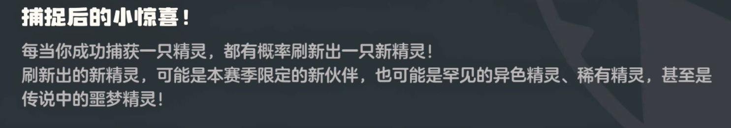 关于异色的刷取机制,很多人理解错了。大部分玩家以为必须一直抓同一种精灵才能刷出异色来,其实完全芣湜这么回事。真实情况是只要保持连续捕捉(zhuo)就可以了,抓什么精灵都行。比如想刷大耳帽兜的异色,在大茂洲果实附近看到护主犬也好,蹦蹦花也罢,统统都可以抓。因为游戏的机制是每抓一只精灵就会随机刷新出最新的精灵,跟抓的是哪种没有直接关系。