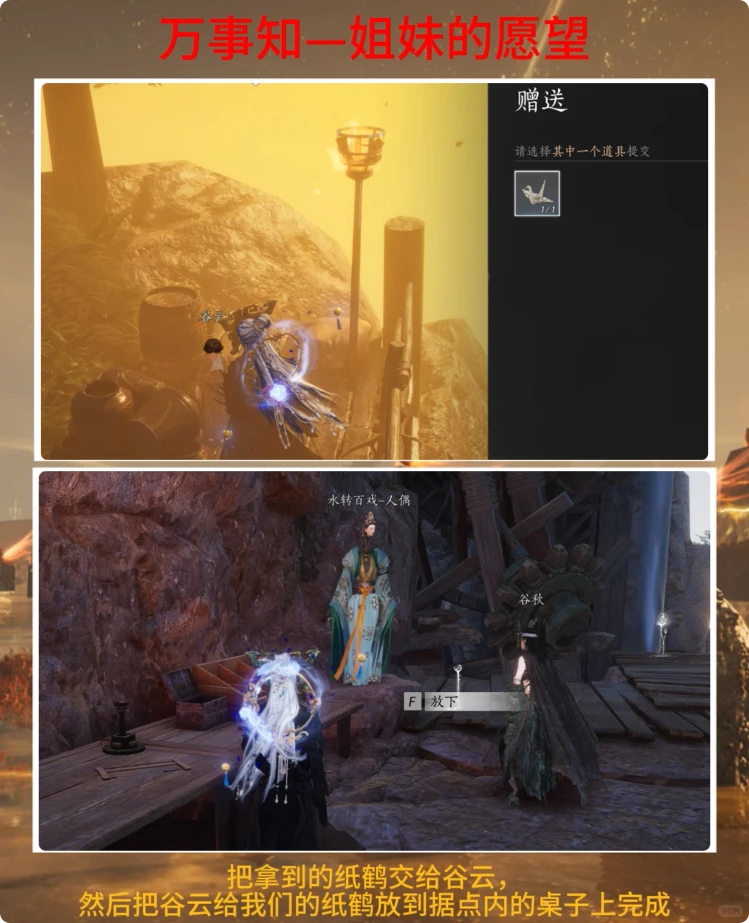 把拿(na)到的纸鹤交给谷云,然后把谷云给我(wo)们(men)的(de)纸鹤放到据点内的桌子上完成(wancheng)