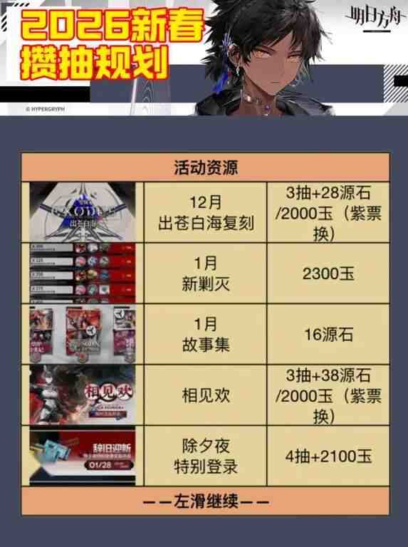 明日方舟2026新春限定池抽卡推荐:你如何看?本文为大家详细介绍了规划(guihua)詳細规划(guihua)大(da)家年新春限定池的抽卡资源攒取规划,包括日常、周常和各种活动的抽卡与合成玉获取方式,需要的小伙伴可以看看下面的内容。