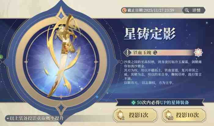 星铸定影池中概率UP的是最新角色的专武,本期的最新角色基安希尔的专武是“铁血玉魄”。
