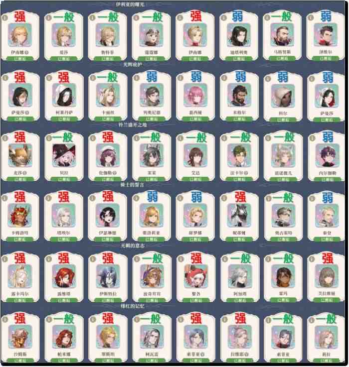各主题中角色强弱大体划分如下:(详细的角色梯度榜可查看铃兰之剑角色综合强度榜(2025年11月))