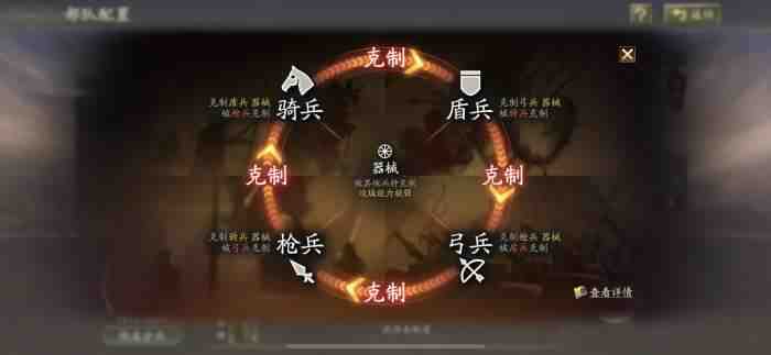 1、兵种克制关系:骑兵克盾兵,盾兵克弓箭,弓箭克枪兵,枪兵克骑兵,所有类型(leixing)的骑兵、盾兵、弓箭和枪兵都能克制器械单位。合理(heli)选择武将的兵种搭配,可以增强阵容的整体实力 。