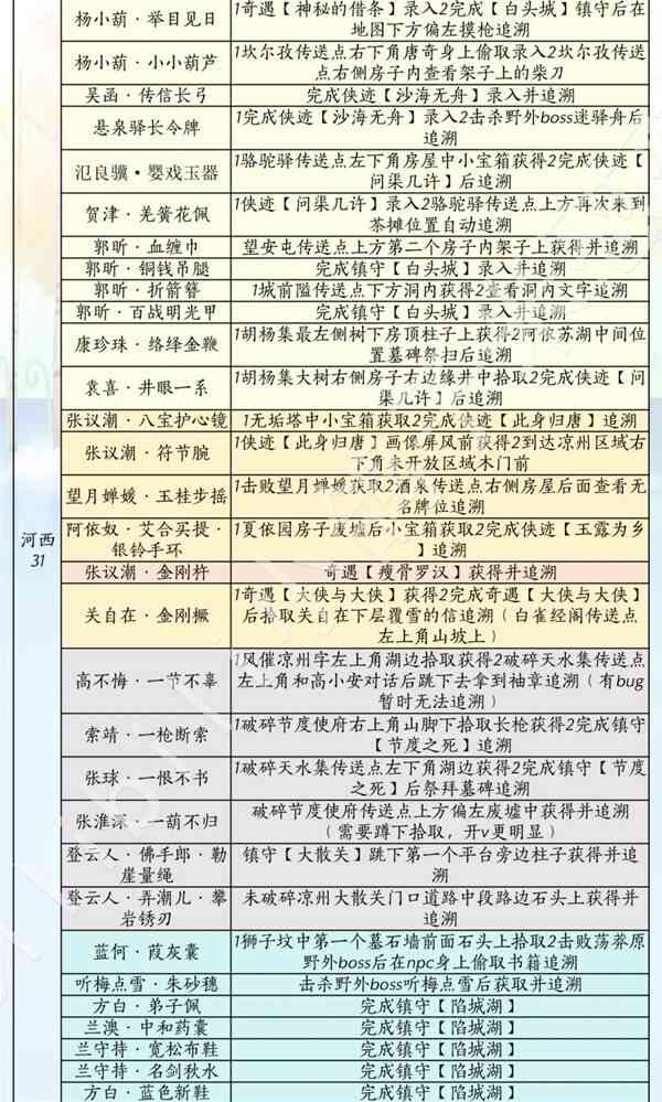 燕云十六声滹沱版本兵戈获取攻略(lue)淡黄色搜索河西或玉门关,橙黄色-凉州,灰色-不见山,粉色-开封(后(hou)续(xu)增加(Increase)内容(content)),金色-家业或傢圎,青色-秦川,浅蓝色-不见山,深蓝色-天陉或飞天城,深深蓝色-滹沱。