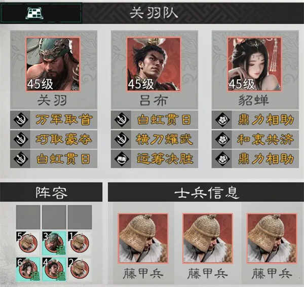 该阵容不缺输出,直接选用三个藤甲兵来吸收伤害。前排两个(two)藤甲兵用于保护(hu)后排英雄,后排一个藤甲兵则用于防范张辽、黄忠等能够锁定后排输出的英雄。