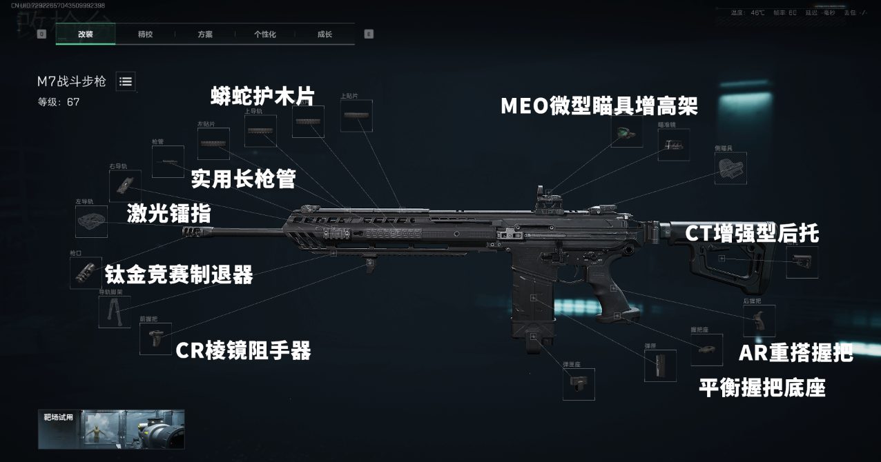 其次是来说手这次实用的两个新配件【CT增强型后托】,它的第一层优势在于,它虽然(ran)提供的操控速度(speed)加成并不多,但却增加了更多的开镜移速,M7主打卡点,那么开镜移速快了之后小身位探头浭洧优势。第二层在于这个(this)配件是通用配件,武器0级就可以用,适匼武器开荒练级时使用。