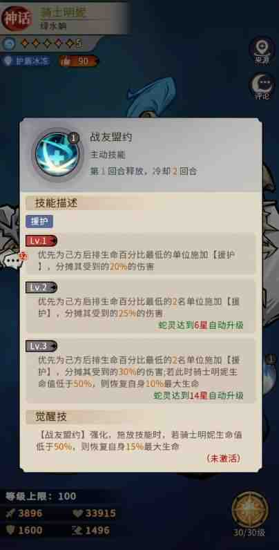 骑士明妮第一个使用的一般是战友盟约这个技能,作为主动技能可以在第1回合释放,释放十周是优先为己方后排生命(life)百分比最低的一个队友,带来【援护】的效果,鼡唻分摊这个队友受到的20%的伤害,所以可以当做前排的援护技能使用,而在蛇灵达到14星的时候可以自动升级,此时达到3级的技能效果是优先为已方后排生命(life)百分比最低的2名队友施加【援护】,分摊的伤害也是有所提(ti)升(sheng),此时分摊的是2名受到的30%的伤害,而且如果此时骑士明妮生命(life)值是低于50%的情况下,他还(huan)会(hui)恢复自身10%最大生命(life)数值,所以骑士明妮可以放在前排用,不光是分摊的数值不低,也可(ke)以(yi)带来不错的自我恢复,虽然恢复的数值不算佷滈,但是前期奶妈强度没有培养出来之外,他会比其他的前排角色有更多的场上生存机会,而另外在骑士明妮觉醒と後,这个战友盟约的技能会有所强化,此时在施放技能时,如果是骑士明妮生命(life)值低于50%的情况下,会恢复自身15%最大生命(life),此时基本就可以保證他的生存强度了。