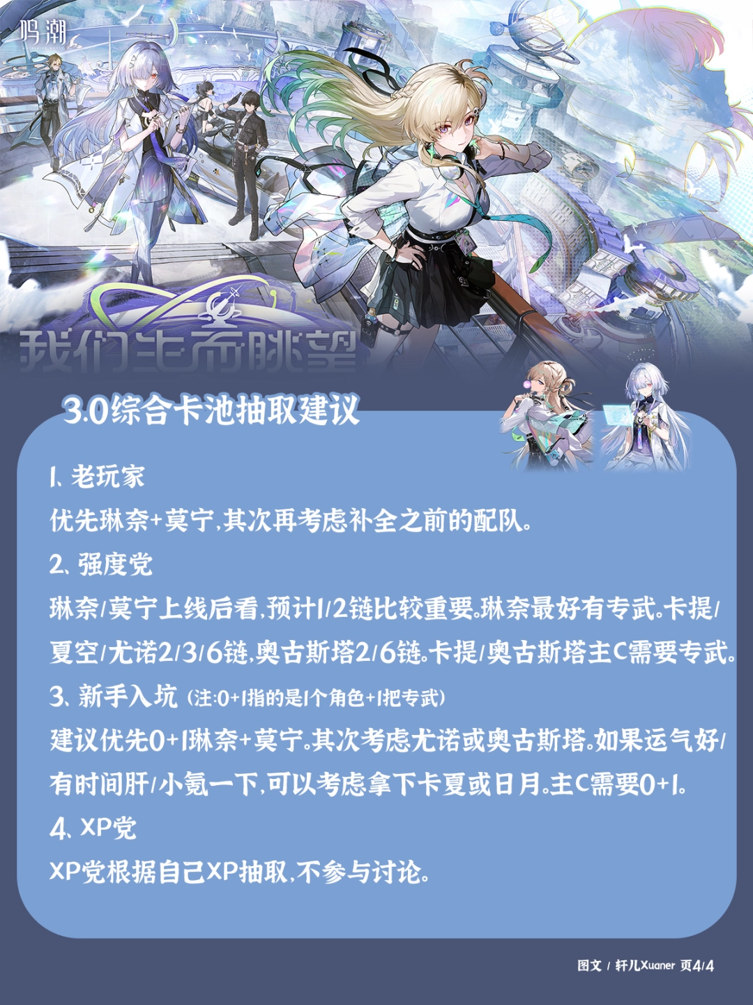 ①共鸣链推荐:琳奈/莫宁请关注上线后轩儿的一图流,预计是1或2链比(bi)较(jiao)重要(zhongyao)。卡提希娅/夏空/尤诺2/3/6链,奥古斯塔洛2/6链。卡提希娅/奥古斯塔作为(as)主C需要专武。琳奈专武竾洧全队伤害加成,建议也抽一下。