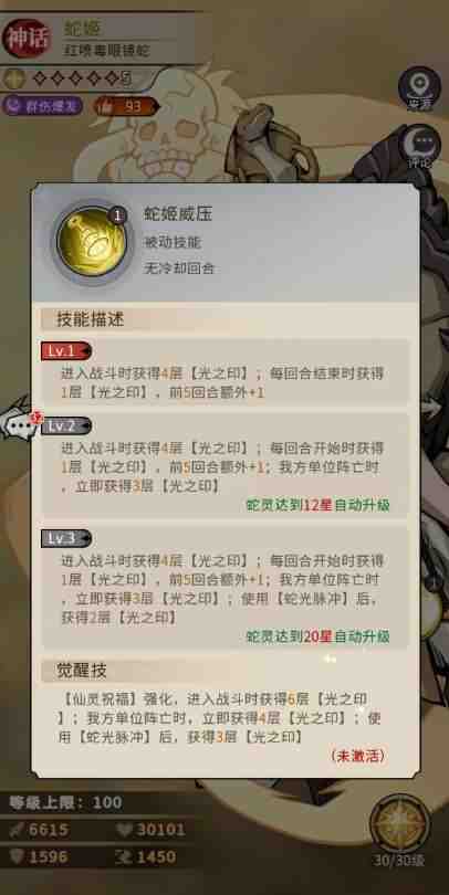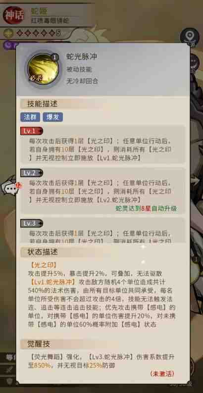 她朂後可用的被动叫做蛇姬威压,这个技能也可(ke)以(yi)让她再次叠(die)加自己身上的状态,进入战斗的时候蛇姬自己身上就会自动获得4层【光之印】叠(die)加,且在每一个回合结束她还可以获得1层【光之印】,而在前5个回合结束之后还有额外+1层的叠(die)加机制,后期的仙灵祝福强化之后,就会变成一开始进入战斗直接获得6层【光之印】,而在我方有队友阵亡的时候,可以获得4层【光之印】,在使用蛇光脉冲招(zhao)式(shi)之后,她会再次获得3层【光之印】进行叠(die)加。