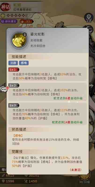 蛇姬的第一个技能是鎏光蛇影,主动使用的时候针对的是法力伤害(harm),给群体的敌人,而且(erqie)蛇姬自身也带了一定的感电能力,所以在这里蛇姬用这个技能攻击敌方的时候是针对中后排的随机3名敌人,对他们造成83%的法伤之后,还会有一个衔接的攻击,也就是基础的攻击之后还有50%概率为目標附加【感电】的影响,【感电】的影响会让受到(dao)攻击的敌人额外损失施法者15%攻击的生命,所以在这里蛇姬自身攻击数值高dailai的这15%数值就can损失敌人更多的血量,而且(erqie)不跟其他的影响类型效果一样是持续2回合,这里一直可以用到3个回合,而在后期觉醒之后,其实在蛇姬的身上会有一个仙子魔法强化的能力,此时她身上的伤害(harm)会提(ti)升(sheng)到131%,然后攻击之后还有75%概率为目標附加【感电】状态,此时还可以为自身dailai一个附加的护盾,虽然只有按照伤害(harm)数值上面50%的护盾数值,但是相当于一半的防护也足够防御很多对面的输出蛇灵了。