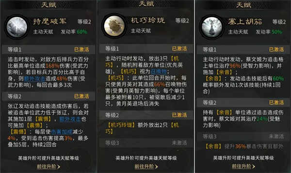 蔡文姬的天賦【塞上胡笳】在为张辽提供兵力恢复的同时,赋予【余音】增益,使其有概率额外(wai)发动一次追击,从而再次提升张辽的输出总量。