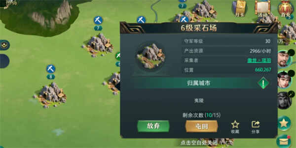 然后每天系统会更新(renew)5次屯田,在占有的伐木场和采石场进行(xing)屯田可以(keyi)一次性获得大量资源,实力越强就(jiu)能(neng)占领高等级的资源点,每小时屯田得到的荍谥也就越多;