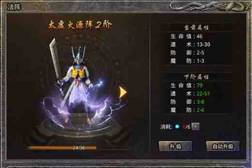 1、法阵一共16阶等,可通过消耗阵法之灵来提升,每提升1阶都会获取多种屬性提升