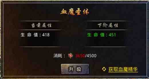 1、血魔圣体最高能提升到50阶等,可通过消耗血魔精华来提升,每提升1阶都会获取屬性提升