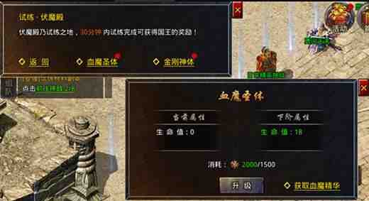 大家在32级可开启血魔之体,通过盟重省-试(shi)炼(lian)伏魔殿NPC进入: