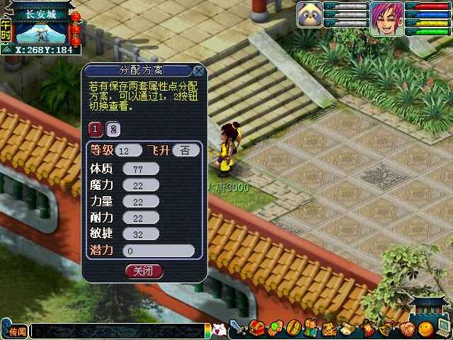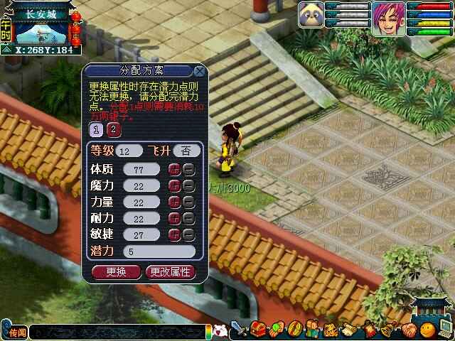 玩家可以到长安云游仙人(264,185)处,保(bao)存自己的当前(dangqian)属性点分配方案,只需(xu)通过(guo)一定(yiding)消耗便可更换(genghuan)成原来所保(bao)存的属性分配方案,保(bao)存次数不限,保(bao)存方案三套,每天(meitian)更换(genghuan)属性次数暂定两次。