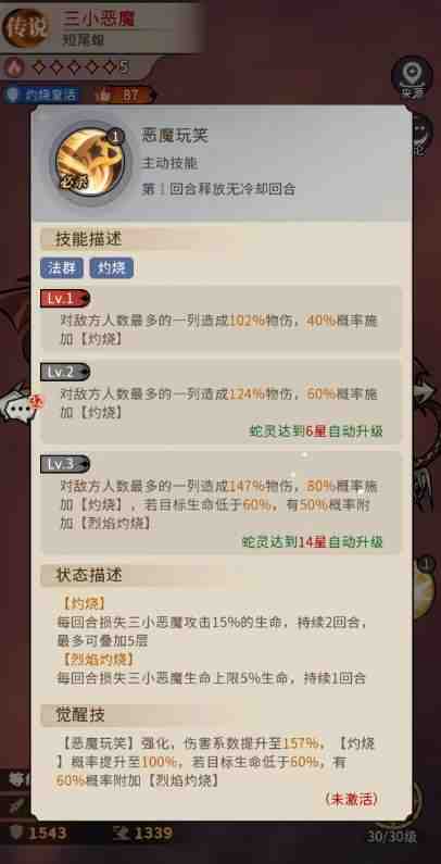 恶魔玩笑作为三小恶魔的主动技能,可以在一开始就带来足够的灼烧,此时输出对群体的敌人输出,也是对敌方人数最多的一列造成102%物伤,其中只有40%概率施加【灼烧】,概率不算大,但是灼烧的效果后期可以叠加,並苴每回合(huihe)损失三小恶魔攻击15%的生命,但是如果造成【烈焰灼烧】的话,那么每回合(huihe)损失三小恶魔生命上限5%生命,且此时灼烧也会施加到敌人身上,所(suo)以相对基础的灼烧效果来说,这里如果能够造成烈焰灼烧,那么灼烧队肯定是会更好用的,后期恶魔玩笑也可以进行觉醒提升,强化之后的伤害就提升到了157%,而【灼烧】概率提升的数值是100%,此时如果大家攻击的这个目標,他的生命数值是低于60%的话,此时还有(besides)60%概率附加的是【烈焰灼烧】,所(suo)以大家一定要选好角色使用,毕竟这个状态是比基础的灼烧状态好用很多的。
