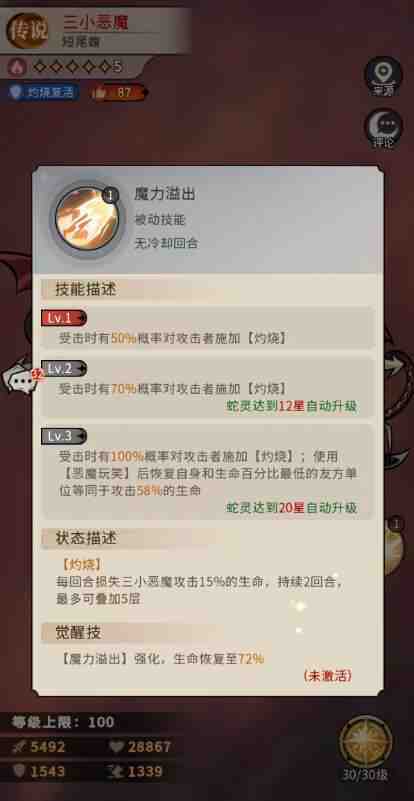 魔力溢出这属于是三小恶魔的最后一款被动,且是没有冷却回合(huihe)的,也就是每一次能够达到触发条件,这个技能就可以用,在上面三小恶魔受击时有50%概率对攻击者施加【灼烧】状态,如果三小恶魔能够提升到20星的话,此时他使用【恶魔玩笑】技能之后还可以恢复自身和生命百分比最低的友方单位等同于攻击58%的生命,適樣的回复虽然少,但是毕竟是涵盖了他自己以及一名最危险的队友,所(suo)以用处还是很多的,而且(erqie)后期【魔力溢出】强化之后,这里的生命恢复就会达到72%的数值,在触发条件不受次数限製的情况下,其实能够成功用到的回合(huihe)还是很多,所(suo)以在恢复数值上面依靠每一款回合(huihe)的叠加,就算遇到的敌人输出频率很高,我方有三小恶魔適樣的一款被动,也可以保证奶妈就算被击(ji)杀,也会有多回合(huihe)的生存时间,而且(erqie)遇到前期大家手中奶妈不算好用的情况,有这个技能也不用担心快速被打下场了。