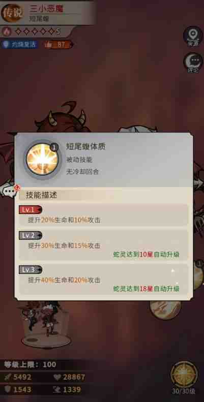 短尾蝮体质作为基础的被动技能,在其中主要是可以提升20%的生命数值以及10% 的攻击效果,而后期想要(yao)这个数值更高,只能从升级技能上面下功夫,只要三小恶魔提升到了18星的话,这里的数值就会变成40%生命和20%攻击了。