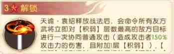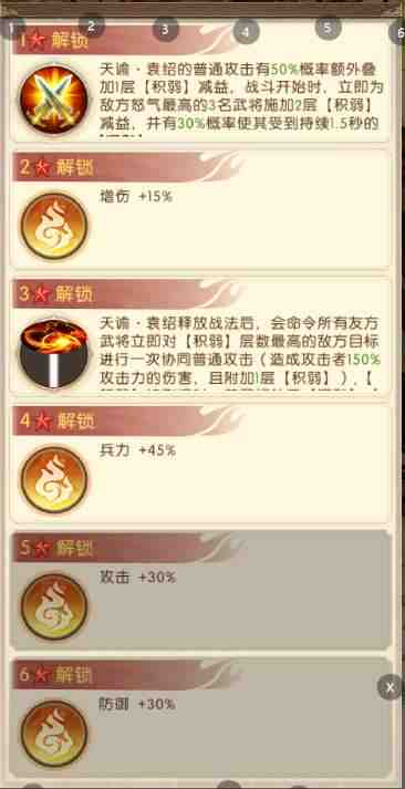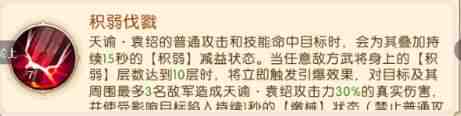 天谕·袁绍的普通攻击有50%概率额外叠加1层[积弱)减益,战斗开始时,立即为敌方怒气最高的3名武(wu)将施加2层[积弱]减益,并有30%概率使其受到持续1.5秒的【沉默】