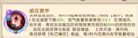此空间有10秒固定冷却时间(领域结束后开始计算)领域基础效果:降低范围内敌方10%最终伤害与20%治疗效果敌方在领域内每(mei)次(ci)释放战法时有40%概率受到持续2.5秒的【威吓】效果(攻击速度下降25%,怒气恢复效率降低15%)在领域内.由天谕·袁绍主动施加的控制效果无视目标20%的控制抗性,且無法被反弹与免疫联动增益:上阵天谕.黄月英:袁绍获得[机巧辅佐)增益,每2秒为范围内友军恢复相当千竟绍攻击力80%的兵力并提升全体10%控制强度,上阵天谕·祝融:袁绍获得[烈炎助阵)增益,领域内敌方单位每秒受到相当于袁绍攻击力80%的火焰伤害,并有10%概率琎叺[灼烧]状态(持续3秒,每秒损失1%最大兵力)同时上阵黄月英与祝融:袁绍额外获得[双姝拱卫]增益.[袁氏威压]领域持续时间延长2秒,且领域内友军单位每(mei)次(ci)释放技能后回复80点怒气,控制效果命中率提升5%