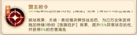 [战法]:对(dui)敌(di)方攻击力最高的3名武(wu)将造成550%攻击力的伤害,同时对目标施加持续3秒的[缴械]状态(禁止普通攻击)和持续2秒的【沉默]状态(禁止释放技能),并有50%概率附加持续3秒的[减速]效果(降低10%攻击速度) 被动效果:天谕·袁绍每(mei)次(ci)释放战法后,为己方全体武(wu)将施加持续3秒的【旌旗庇护]效果,提升15%异(yi)常(chang)状态抗性,并获得5%的伤害减免