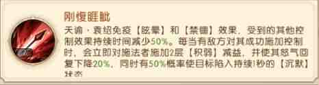 天谕·袁绍免疫【眩晕]和[禁锢]效果,受到的其他(ta)控制效果持续时间减少50%。每当有敌方对其成功(gong)施加控制时,会立即对施法者施加2层[积弱)减益,并使其怒气回复下降20%,同时有50%概率使目标陷入持续1秒的[沉默)状态