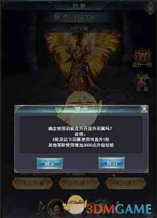 1、翅膀提升分为两种升阶途径:金币提升和神羽提升。
