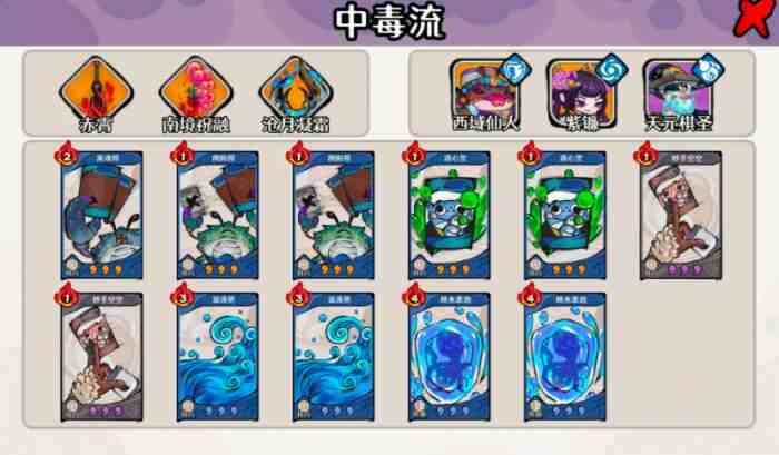 【中毒流】——低星启动、无视反伤、范围压制型阵容 核心组合:西域仙人 + 紫镰 + 天元棋圣(三水属性) 关键(jian)要求:紫镰需达四星,其余角色一星即可(can)激活樭绌循环。该体系不依赖真气技能(skill),全程以毒系持续伤害为核心输(shu)出逻辑,对护甲与反伤类敌人具备天然克制效果(xiaoguo)。实战覆盖范围广,对中前期至中期多数幻境关卡均能实现压倒性清场效率。所需卡牌清单:离魂符×1;阴阳符×2、清心咒×2、妙手空空×2、浪涛势×2、秋水柔劲×2。