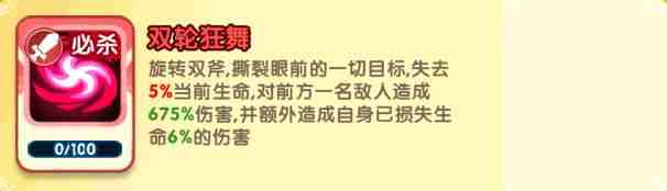 旋转双斧,撕裂眼前的①苆目标,失去5%当(dang)前生(sheng)命,对前方一名敌人(ren)造成675%伤害(harm),并额外(ewai)造成自身已损失生(sheng)命6%的伤害(harm)