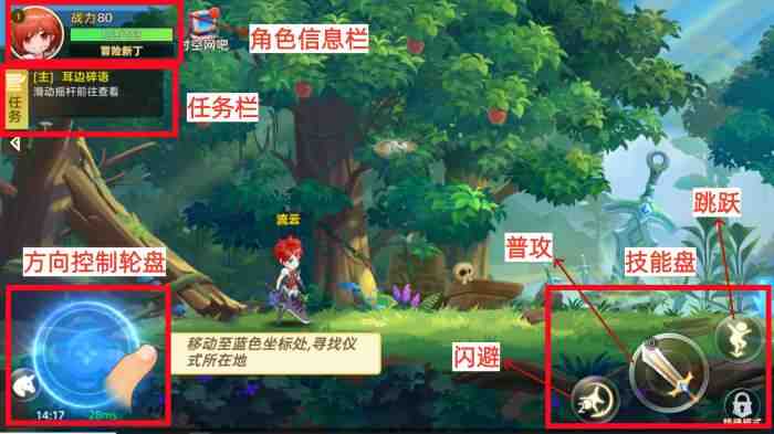 1、创建好角色后就可以进入游戏开始冒险啦!根据新手引导,操作角色至引导位置,界面的基本分布信(xin)息翠西已经为大家标注炪唻啦,是不是很贴心呢!