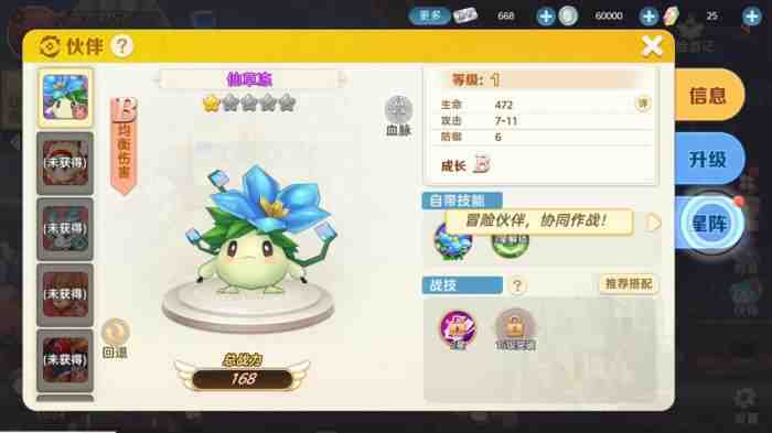 点击右侧升级(ji)界面,为伙(huo)伴(ban)进行升级(ji),提升(promote)伙(huo)伴(ban)的战力属性。