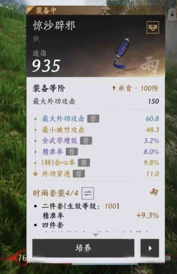 燕云十六声滹沱版本唐横刀装备搭配攻略1:精准率:精准率三条,搭配精准弓即可达到满值(全承音装备都可以满)