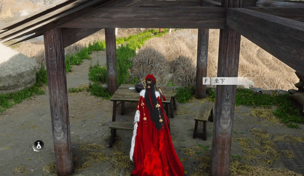 仍在流民营地传送点附近(fujin),找(zhao)到图示的 竹棚。走到竹棚内的长椅旁,点(dian)击坐下。