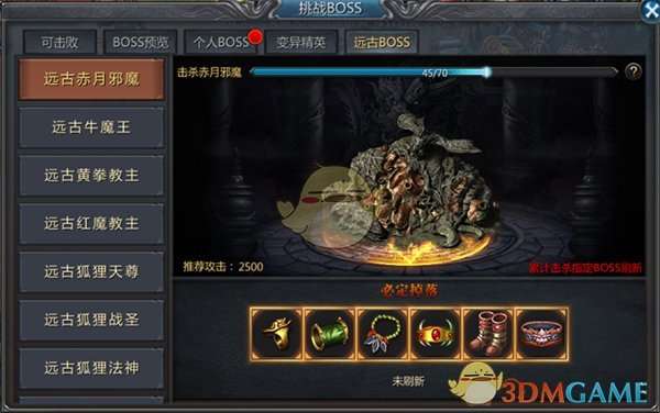 5、击杀相应BOSS达到指定数量会召喚远古boss,远古boss必定会掉落高级装备!