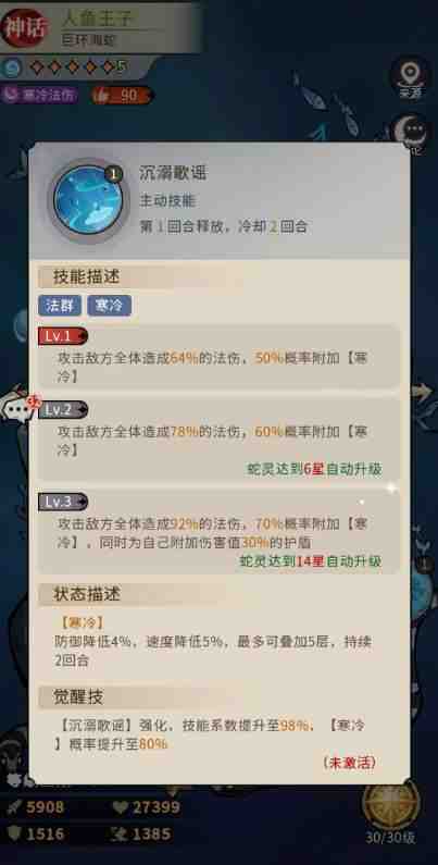 人鱼王子的主动技能叫做沉溺歌谣,这个技能上就有一定(must)的寒冷效果(xiaoguo)可以用到的了,攻(gong)击(ji)时可以给敌方全体造成64%的法伤,且有50%概率附加【寒冷】的状态,这里【寒冷】的状态会让敌人身上的防御降低4%,速度降低5%,叠加5层的时候(shihou)这里的速度影响就非常大了,且在达到技能三级的时候(shihou)就变成攻(gong)击(ji)敌方全体造成92%的法伤,70%概率附加【寒冷】,同时为自己附加伤害值30%的护盾,所以在这里他后期给自己带来的(come)保护能力也不弱,且相比其他的蛇灵,人鱼王子身上的等级提升很快,只要14星的时候(shihou)就可以解锁技能等级3的能力,所以后期他能够达成的觉醒技强化也很快,得到强化之后的他在技能系数上面直接提升至98%,而【寒冷】状态施加成功的概率提升到80%,算是非常高的(High)一个数值了。