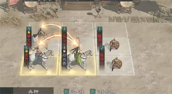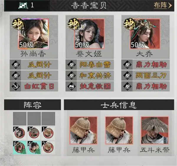 兵种(Arms)站位:孙尚香前方放1个五斗米提升续航,前排放置2个藤甲兵抗伤即可。