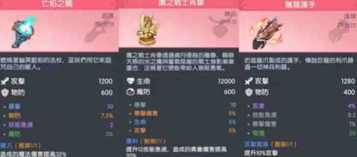 主(zhu)要(yao)的套装應該选择(hoose)攻击套,四部位全员配置就能稳定提升10的基(ji)础攻击,搭配套装附带的技能(jineng)急速加成,就能迅速的加快奥义技能(jineng)冷却,还能提升机械球产出的频率,让输出的循环更加的流畅。如(ru)果追求爆发性的伤害,也可以替换1~2件爆伤套装,但是需要保证暴击率不低于1000避免伤害溢出。武器方面可以选择(hoose)亡焰之触法杖,附带的魔力套装效果就能迅速的提升32%的魔法伤害,能符合阿瑞斯的输出机制。