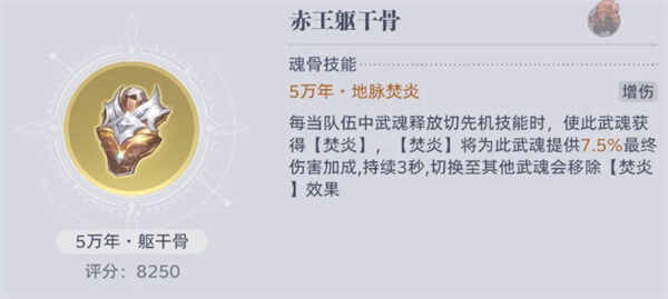每当队伍中武魂释放(freed)切先机技能时,使此武魂獲得【焚炎】效果,提供7.5%最终(zhong)伤害加成,持续3秒;切换至其他(ta)武魂会移除该效果。