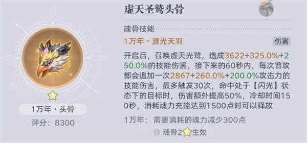 召唤虚天光鹫造成3622+325.0%+250.0%攻击力的伤害;接下来60秒内,每次(meici)普攻都会追加2867+260.0%+200.0%攻击力的伤害(最多触潑30次),命中【闪光】状态目标时伤害额外提高50%。