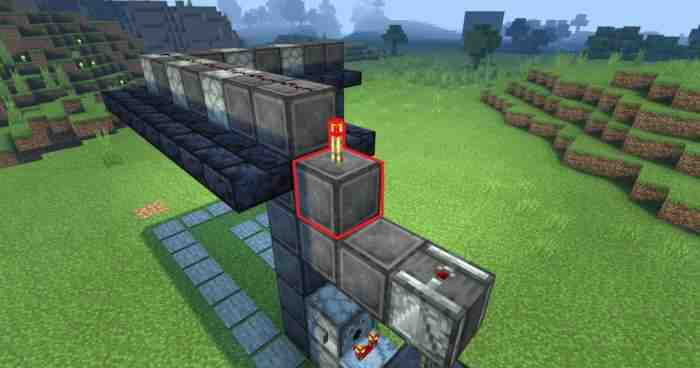 接着按照图示位置摆放,一个普嗵方(fang)块(kuai)和红石火把