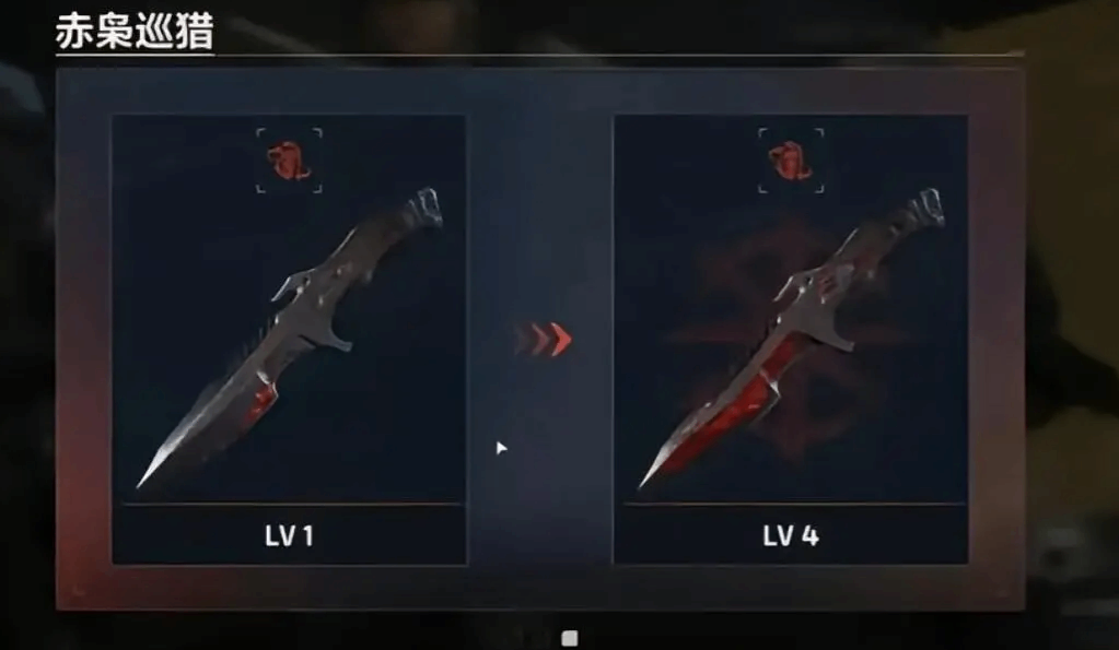 可升级短刀「处刑者」:零氪可获取,通过「赤枭巡猎」模式升级,具备四级外观變化与专属(shu)攻(gong)击动作(dongzuo)。