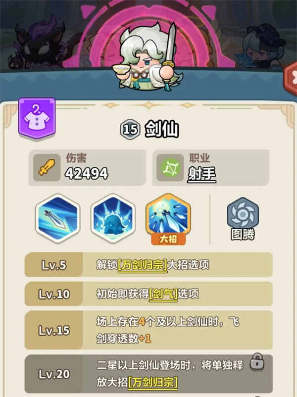 1、由于剑仙的词条除巨剑术外均可对所有剑仙生效,尤其是在剑仙达到15级之后,还会解锁额外(additional)被动:场上存在4个及以上剑仙时,飞剑穿透次数+1的效果。所以上场剑仙的薮糧就显得尤为重要。