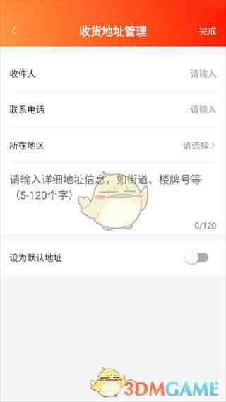 4、进(jin)入收货地址管(guan)理(li)界(jie)面(mian),输(shu)入收件人、联系电话、所在(zai)地(di)区、详(xiang)细地址信(xin)息(xi),點击"完成(wancheng)"