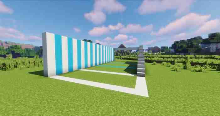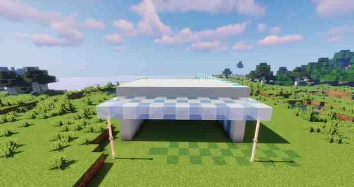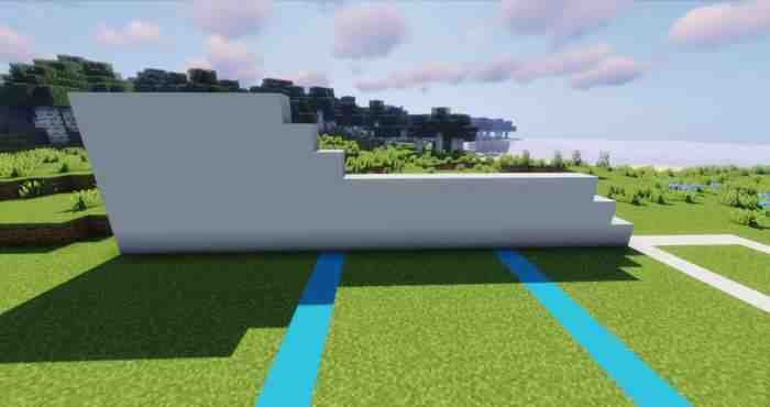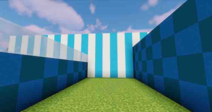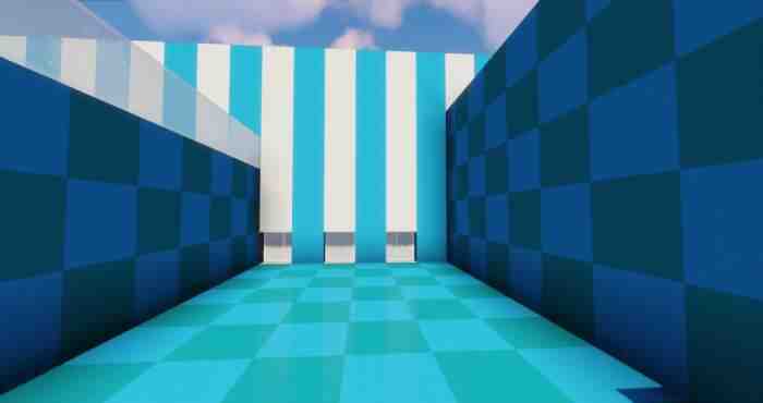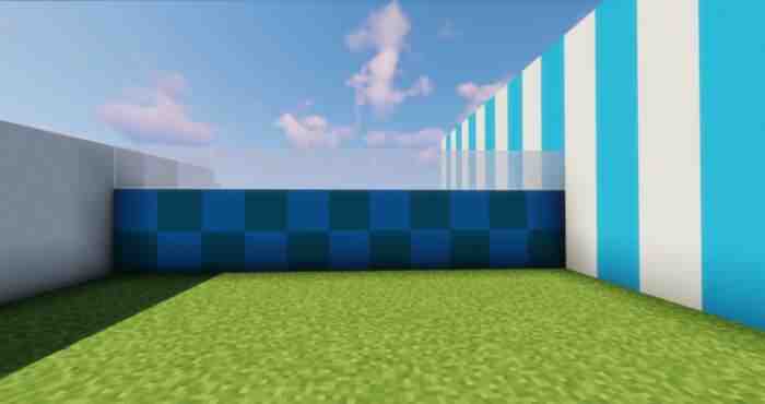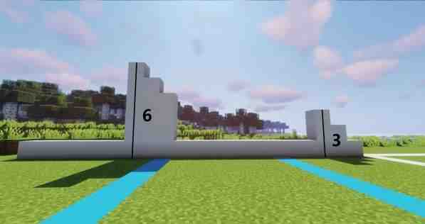 白色混凝土搭建出高于地面1格的平台,接着用蓝色、青色混凝土再搭高1格,混凝土上放上白色染色玻璃,搭出如下样式。