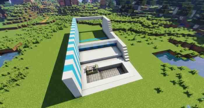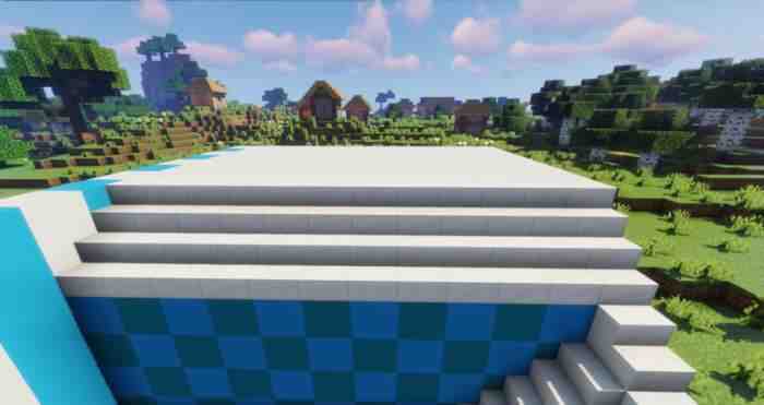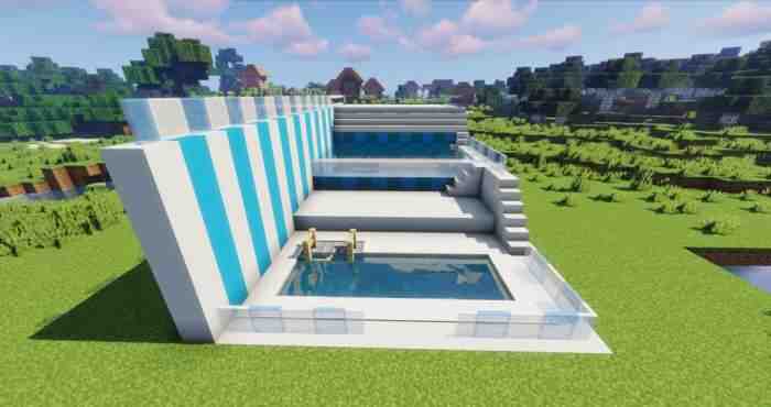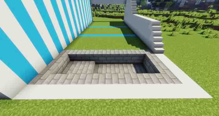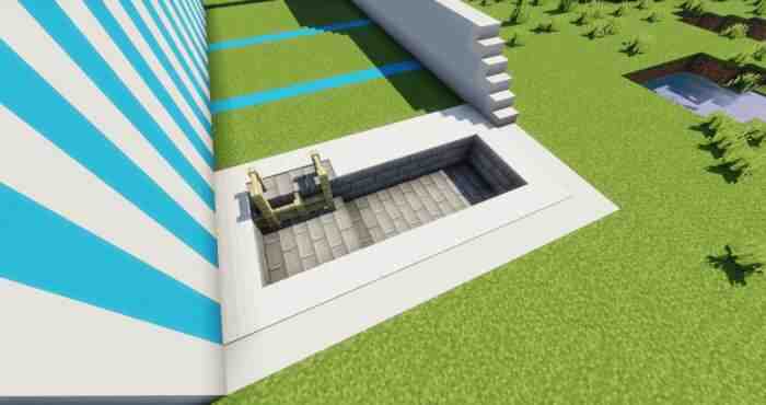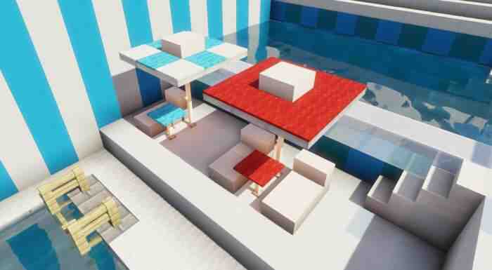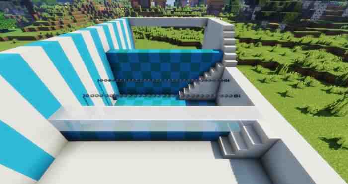 第二层是一个比较深的泳池,建起墙面并往下拓展2格,将混凝土交叉放置做成泳池,如图所示搭出楼梯,用锁链做出泳道。