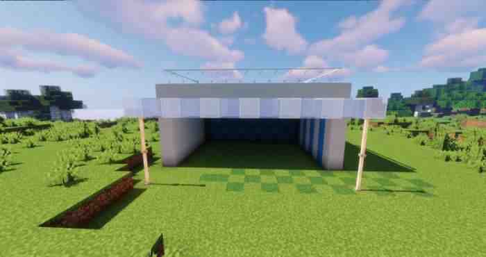 绕到建筑后方,采用末地烛与蓝白染色玻璃开始拓展,做出一个大棚。