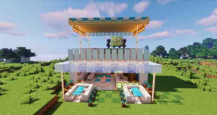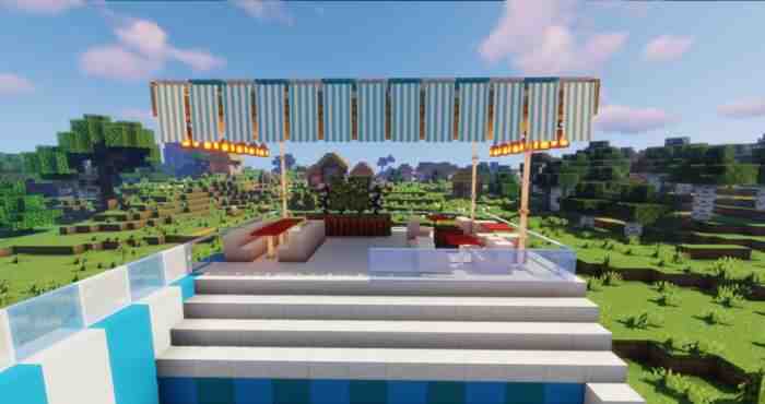 来到二层平台,用石英台阶、石英楼梯、围栏、羊毛等,做出躺椅、遮阳伞和饮料台。