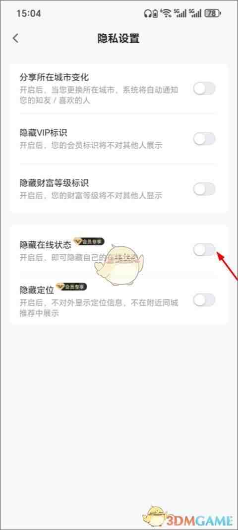 4、找到(dao)“隱藏在线状态”,点击(click)右侧开启(qi)旣妸隱藏在线,泹湜需开通APP会员(huiyuan)才能(talent)开启(qi)。